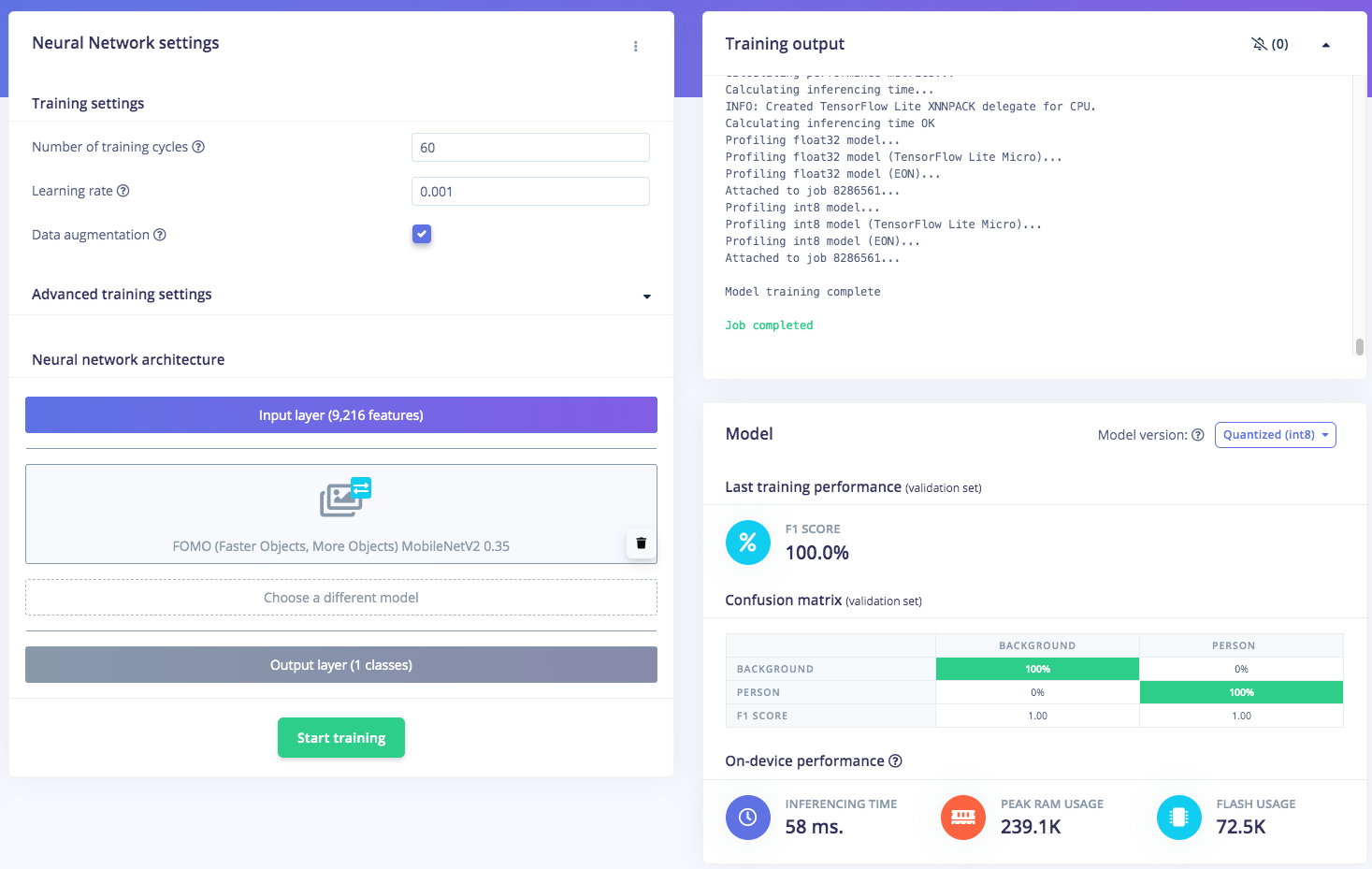 Each image was labeled by drawing a bounding box (with assistance from AI that helps to draw them) using the Labeling Queue tool. Then Suryo pivoted to the creation of the impulse, which is what defines the flow of data from the time it is captured by the sensor all the way until a prediction is made by the model. The impulse began with preprocessing steps to first shrink the images and convert them to grayscale, then extract the most informative features — all critical steps that reduce the computational complexity of downstream processing steps. The features are then fed into Edge Impulse’s ground-breaking FOMO object detection algorithm that is highly optimized for accuracy with minimal resource utilization (typically less than 200 KB of RAM is required).