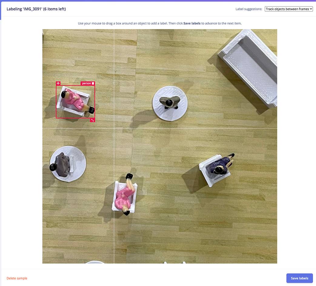 To make the most of the hardware resources, Suryo captured images of the model building from above, such that a single camera could cover all four of the zones that he defined. A number of images were captured from above, with different configurations of occupants, and under different lighting conditions, to be used as training data for the object detection model. The variety in the training data would be expected to help the model to generalize well such that it can perform with accuracy under many different real-world conditions. After the data was collected, it was uploaded to a project in Edge Impulse Studio.