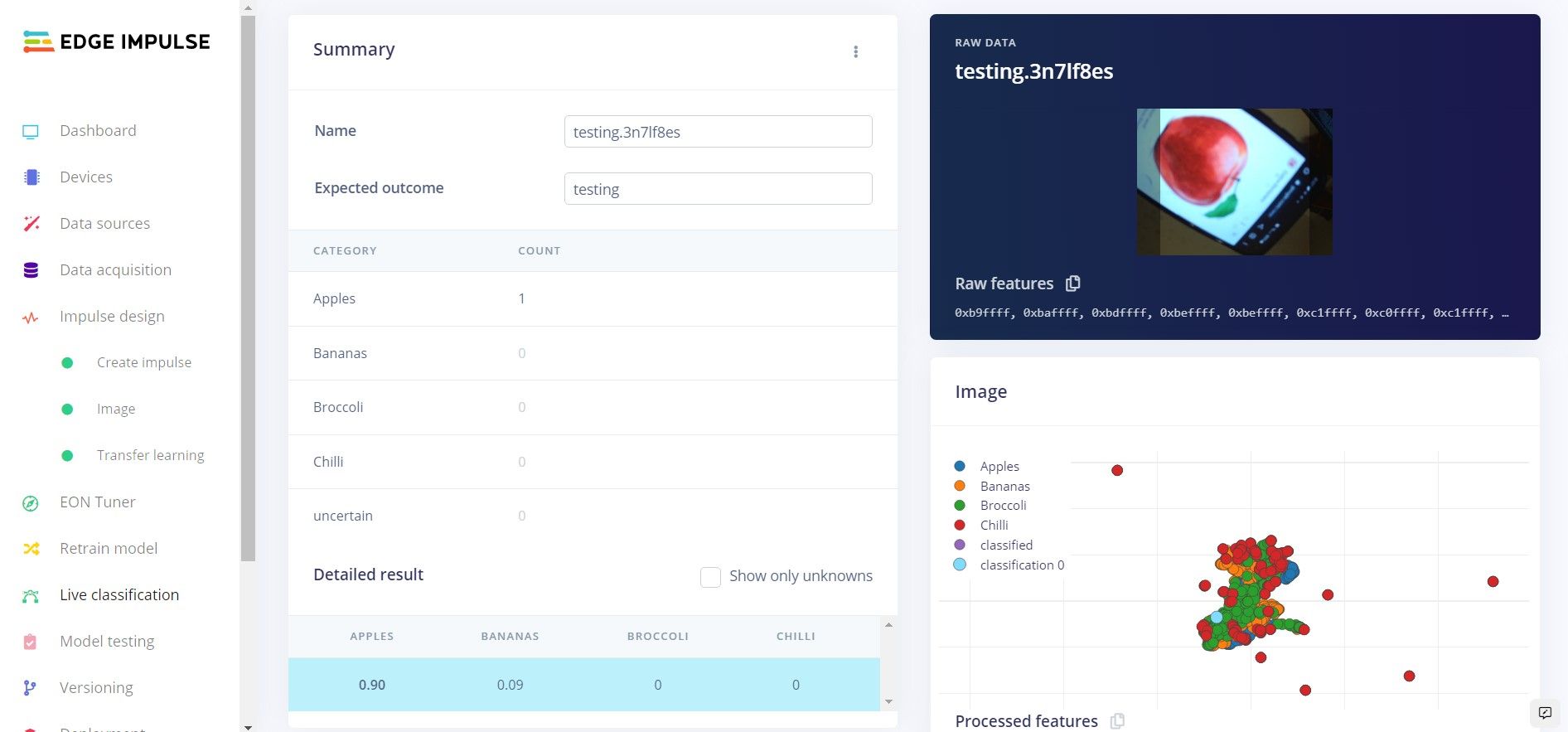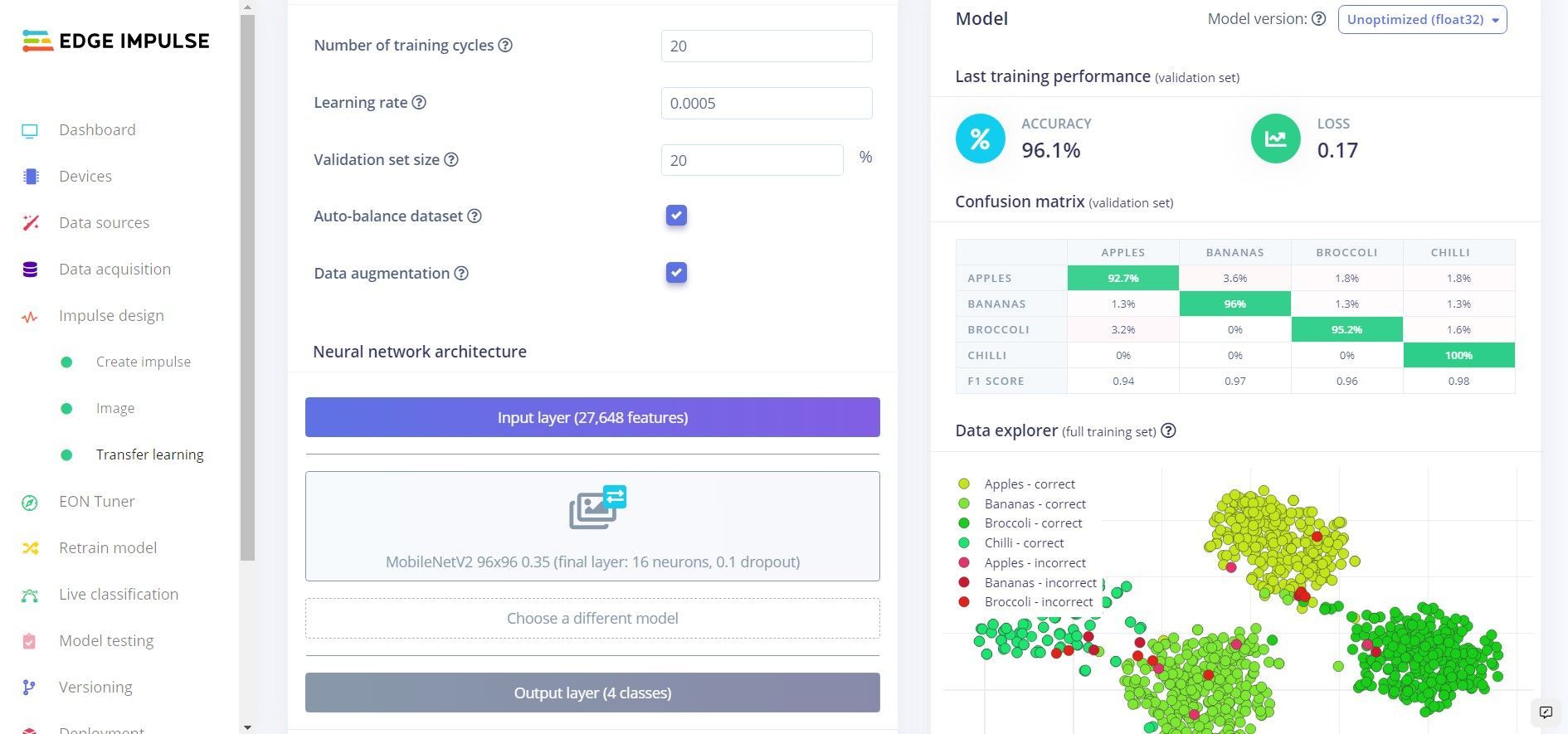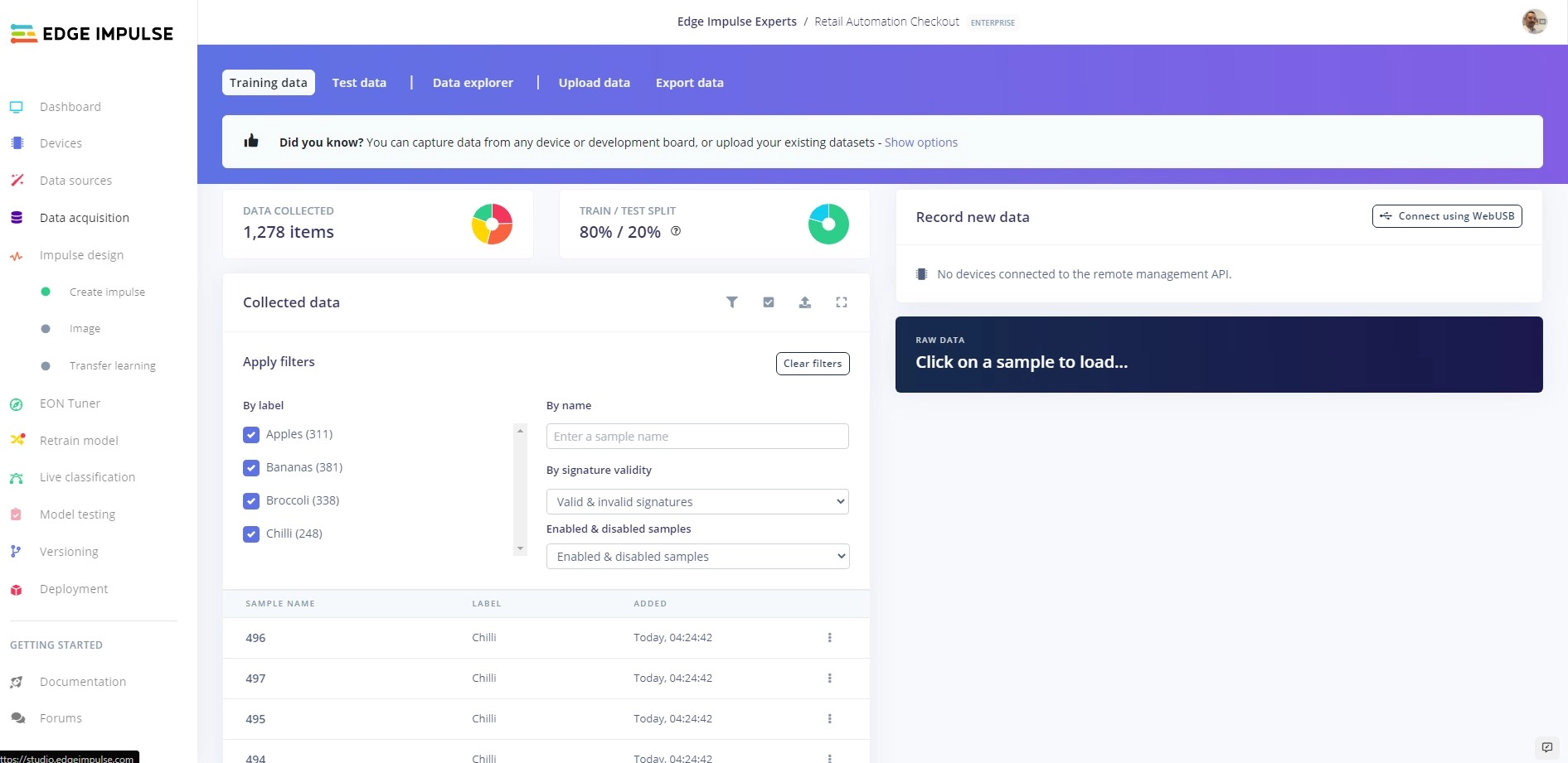 With a plan mapped out and the hardware all squared away, the next thing to do was collect some data to train the neural network. A publicly available dataset consisting of images of fruit and vegetables was located, and about 1,200 images of apples, bananas, broccoli, and chili peppers were extracted from it and uploaded to a project in Edge Impulse Studio using the data acquisition tool. Labels were automatically assigned to each image based on the file names, which saved a lot of time that would have otherwise been spent doing annotation.