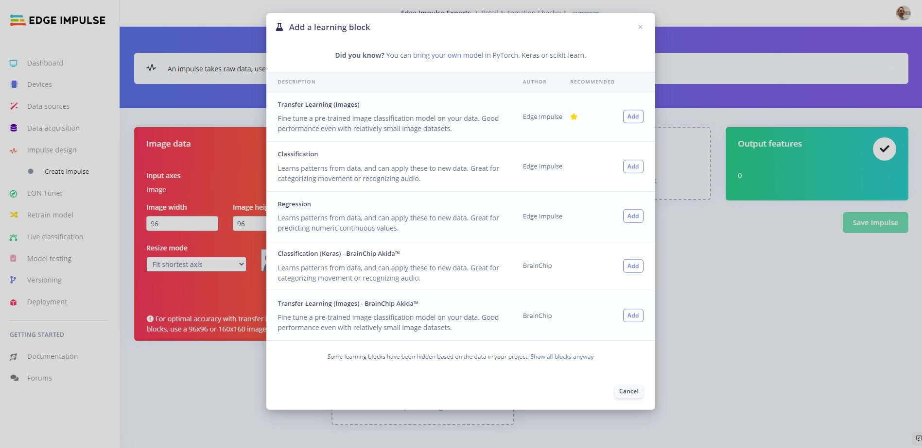 Speaking of machine learning algorithms, everything was in place for Milton-Barker to start designing one, so he pivoted to the Impulse Design tool. The impulse defines how sensor data is handled, from initial collection all the way through to a prediction from the trained model. In this case, the impulse started with a step that resizes images to reduce the computational resources needed for downstream analyses. Another preprocessing step calculates and extracts the most important features from the input data, which helps to increase prediction accuracy. These features finally make their way into a MobileNetV2 neural network classifier that has been pretrained to give it a general knowledge of how to recognize different objects in an image.