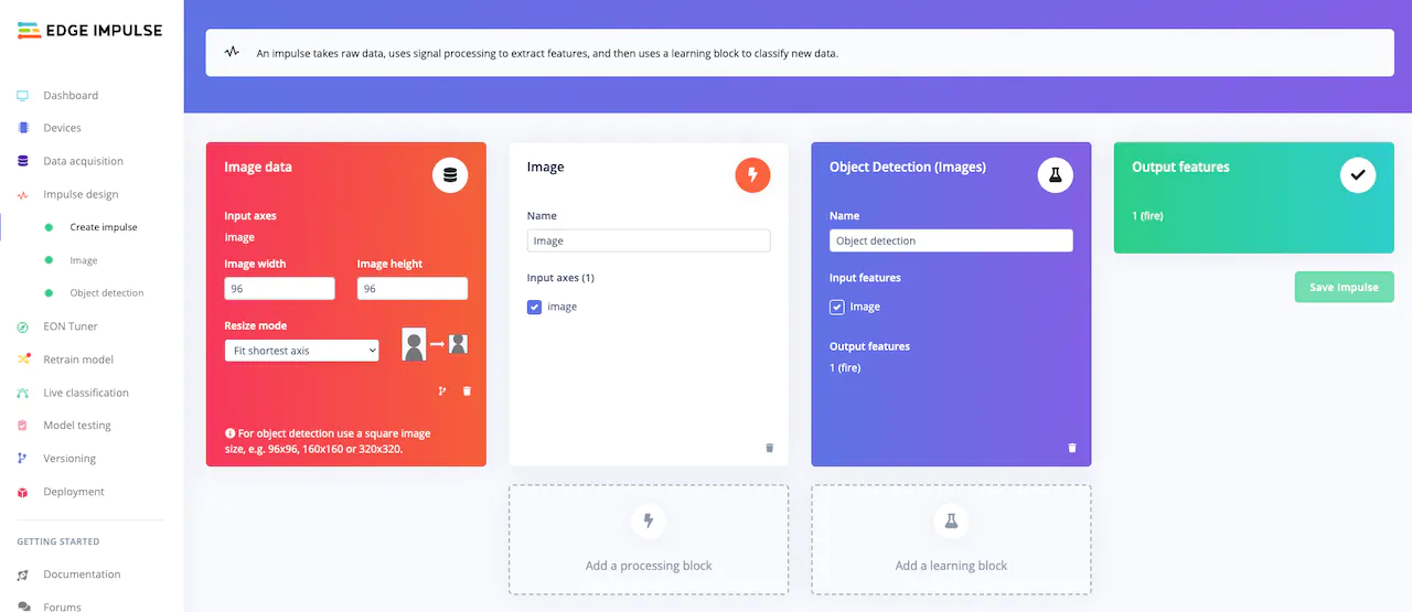 This tool automatically splits the data into training and test datasets, and allows one to examine the images to confirm that the labeling is accurate. With the data all squared away, everything was in place to design the impulse. Built using a graphical interface, the impulse specifies exactly how data will be processed, from the moment it comes off the sensor until a prediction is made by the machine learning model.
