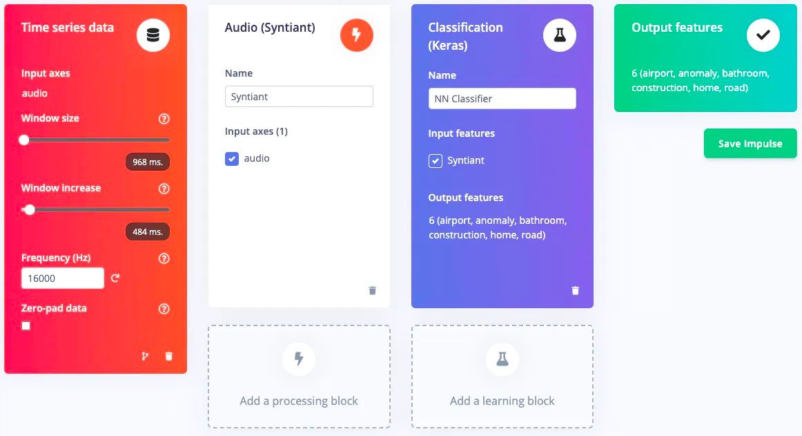 An impulse was then designed to handle processing and classifying these audio samples. A preprocessing audio (Syntiant) block was added to extract the most relevant time and frequency features from the signal. It also performs additional processing specific to the Syntiant NDP101 chip to make the most of this neural network accelerator. Finally, a neural network classifier was added to learn the mappings between features and environmental sound classes. The default hyperparameters were kept, and just like that, the machine learning model design was finished.