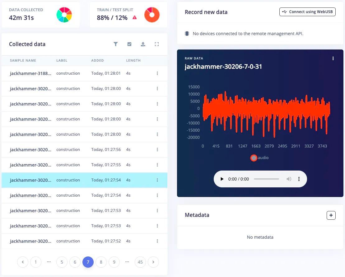 Before jumping in and building the machine learning classification pipeline, audio samples would be needed to train it. For the proof of concept, Verma chose to focus on recognizing airports, roads, offices, bathrooms, construction sites, homes, and also unknown, quiet environments. Examples of each class were extracted from the ESC-50 public dataset, then were uploaded to Edge Impulse Studio using the data acquisition tool. From there, data can be visualized, split up, filtered, labeled, broken up into training and testing sets, and just about anything else you might need to do with raw data.