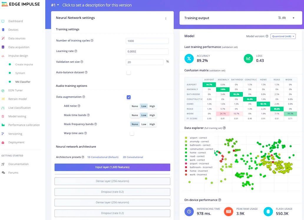 The Feature Explorer tool was used to check separation of samples between classes. Satisfied with how the data looked, Verma started the model training process. While the overall classification accuracy was quite good at better than 89%, the confusion matrix showed that the office class was not performing very well. Verma used the data acquisition tool to dig further into those samples and found that they only consisted of keyboard and mouse sounds. He did not think these sounds were adequate to represent the class, so that class was removed and the model was retrained.