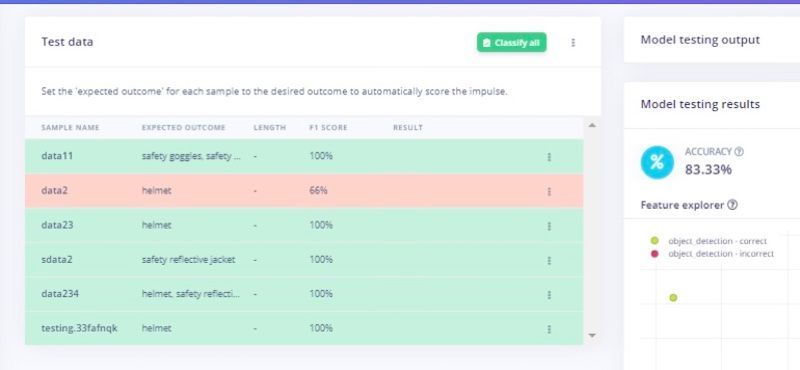 The model was performing better than necessary to prove the concept, however, so the model was deployed to the Jetson using the Edge Impulse for Linux CLI. Edge Impulse’s Python SDK was then used to run the object detection model directly on the local hardware. Within minutes the device was ready to start checking for safety gear. Sivan ran some live tests to verify that the system was working end to end, and found it to be performing quite well.