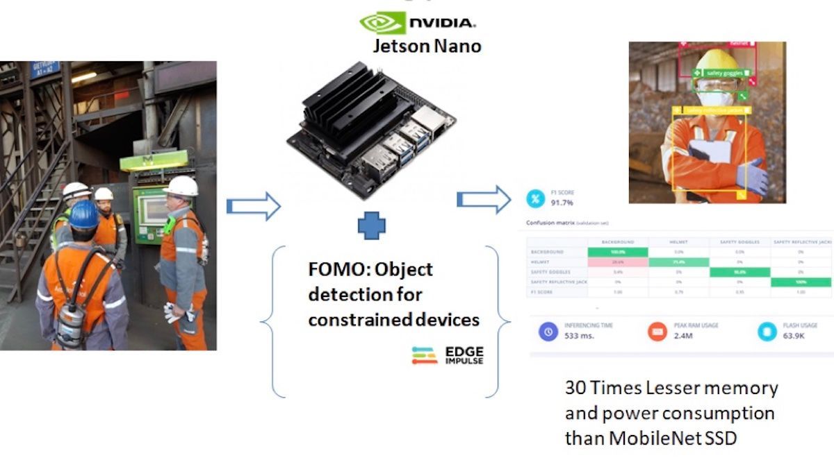 To ensure that inferences run fast enough that all workers can be assessed in real-time, Edge impulse’s ground-breaking FOMO™ algorithm was selected to handle object detection. FOMO is 30 times faster than MobileNet SSD, and is optimized for use on resource-constrained edge computing devices. With a relatively powerful platform like the Jetson Nano, running inferences at 60 frames per second is easily achievable.
