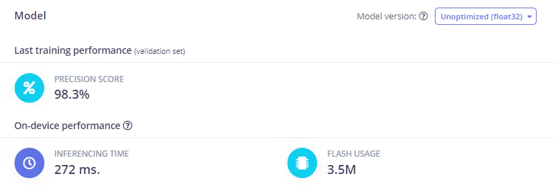 After finishing the impulse design, the training process was started with the click of a button. After a short time, results were presented to help in assessing how well the model was performing. It was found that a precision score of better than 98% was achieved right off the bat. And since Edge Impulse created machine learning models that are highly optimized for tiny platforms, the model size was a miniscule 3.5 megabytes, which is well within bounds for the relatively powerful Raspberry Pi. Furthermore, inference times were quite snappy, clocking in at about 270 milliseconds.