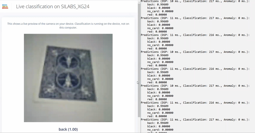 The Silicon Labs xG24-DK2601B EFR32xG24 Dev Kit is fully supported by Edge Impulse, so deployment was as easy as downloading prebuilt firmware image for this board from the deployment tab, then flashing it to the hardware. This firmware has the full machine learning pipeline embedded within it.