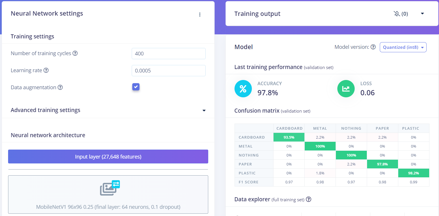 At this point, the stage was set for building the impulse — this defines the workflow that processes data all the way from the raw sensor measurements to the classification prediction. This impulse started with preprocessing blocks that reduce the size of the input image and prepare the data for input into a neural network. Decreasing the image size is critical, because it reduces the computational resources that will be needed by downstream algorithms and allows them to run on resource-constrained hardware platforms. This transformed data was then fed into a pretrained MobileNet V1 model. Leveraging the existing knowledge in the pretrained model allowed Vikstrom to achieve a high degree of classification accuracy after training on a small dataset.