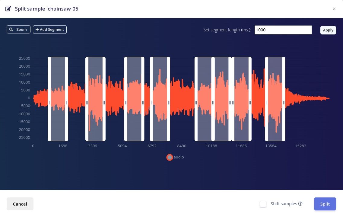 Before building a machine learning model, the team needed to create a training dataset for it to learn from. For the initial version of the device, the decision was made to detect the sound of chainsaws. Since this type of data is a bit difficult to collect, a publicly available dataset was located and uploaded to Edge Impulse Studio using the data acquisition tool. Samples were uploaded for both a chainsaw class and a normal background noise class. Audio clips for both classes were split into one second segments to make them consistent. A total of approximately 42 minutes of audio data was supplied, which was automatically split into training and test sets.