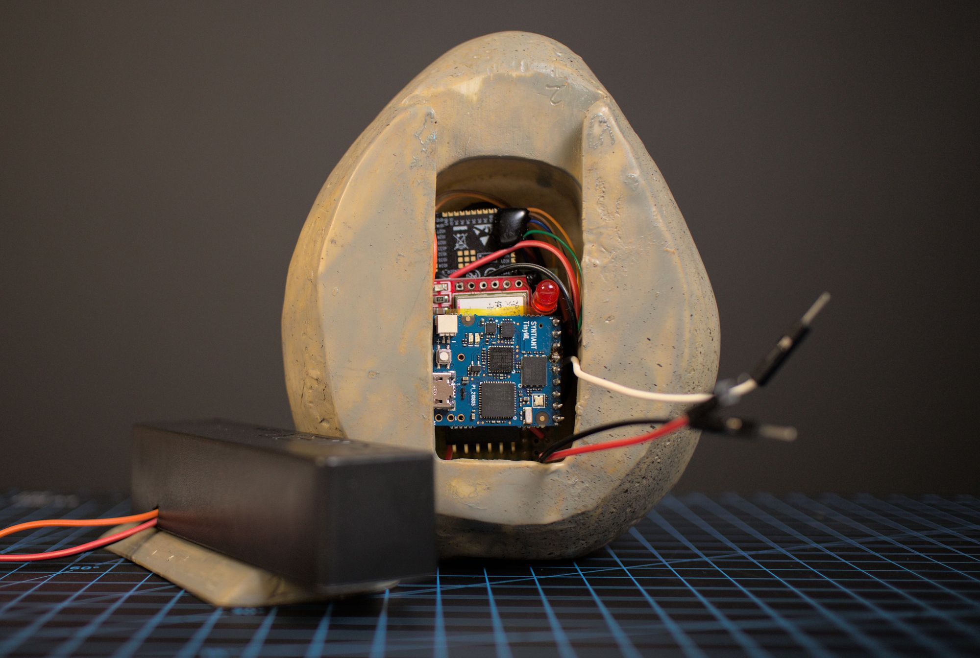 The deployment tool in Edge Impulse Studio was used to create an Arduino IDE-compatible library that contained the entire machine learning analysis pipeline. A small tweak was made to the code to put a signal on a GPIO pin when the sound of a chainsaw was detected. This in turn triggered the ESP32 microcontroller to send an SMS message via the SIM800L module. The hardware was all housed inside of a fake stone with a cavity in the middle. This served to not only protect the hardware from the elements, but also camouflage it from illegal loggers that may want to destroy it.