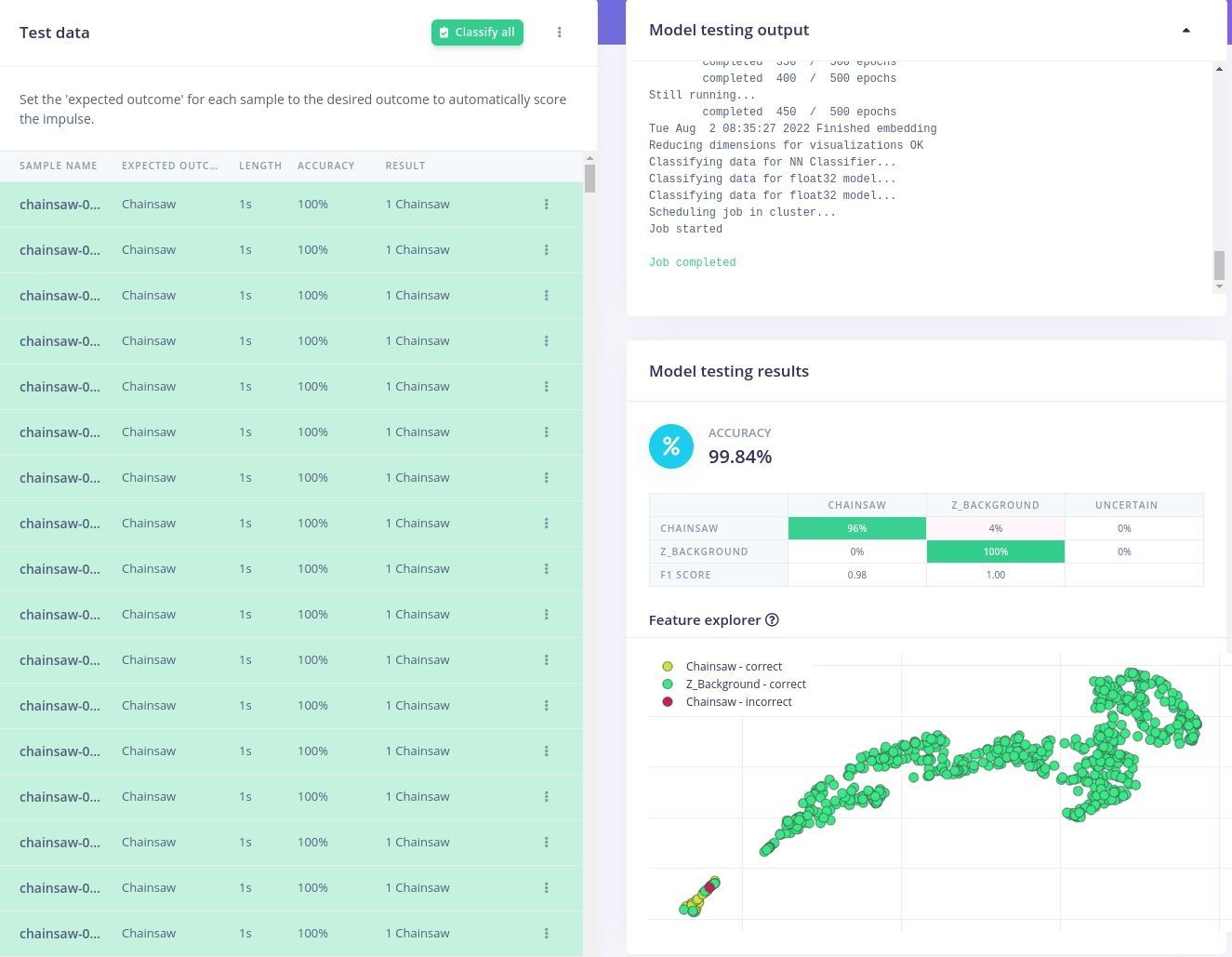 With the hardware design and data collection complete, it was time to build the machine learning classification pipeline. The impulse started with a step that splits audio samples into windows of precisely 968 milliseconds, which is required by the Neural Decision Processor. These windows of audio data were then fed into a Audio (Syntiant) preprocessing step that computes log Mel-filterbank energy features from the audio signal. Finally, these features are passed into a neural network classifier that is designed to tell the difference between the sound of a chainsaw, and normal background noises.