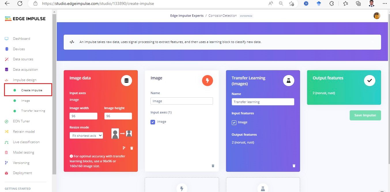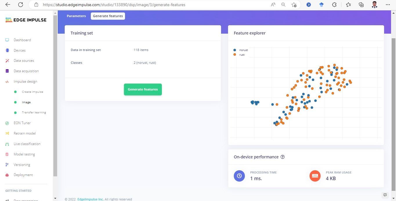 With the overall plan worked out, and the hardware decided upon, Raza needed to build a dataset to train the machine learning classifier. Fortunately Raza was able to avoid the difficult task of creating this dataset himself by locating a publicly available set of images. From this dataset he extracted a set of 150 images of corroded metal, and a further 150 of metal lacking corrosion. The images were uploaded to Edge Impulse Studio using the data acquisition tool, where class labels were automatically assigned based on the file names.