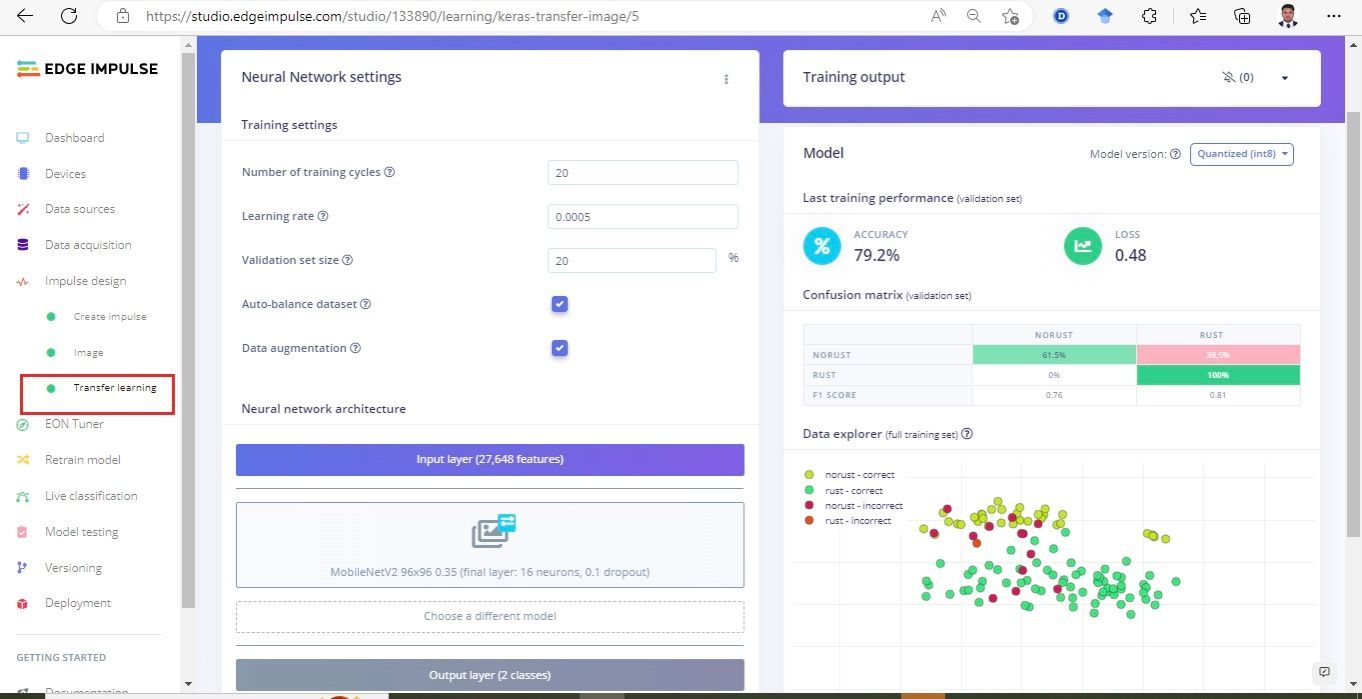 Processing image data can get computationally expensive very quickly, so Raza chose a preprocessing step that resizes images to 96 x 96 pixels to begin the impulse design. Next, a step was added to extract the most important features from the image data, and finally those features were passed into a transfer learning block. The transfer learning block takes advantage of a MobileNetV2 96x96 0.2 model that has already been pretrained on a large dataset for image recognition tasks. By leaning on that knowledge already baked into the model, Raza was able to use his relatively small training dataset to build an accurate classifier. After tuning a few hyperparameters and optimization settings, the training process was started with a button click.