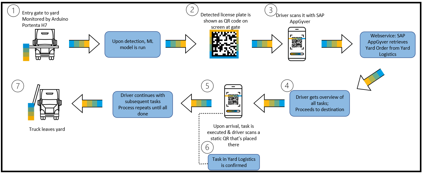 An automatic license plate recognition algorithm was created that can identify each truck uniquely without any action being required by the driver. When a truck first approaches the yard, the plate number is detected, and by checking that number against the data in Yard Logistics, the system determines if the driver should be allowed into the yard. If so, they are given a list of tasks to complete for the day that they can view in a smartphone app. This list specifies each location that they need to visit, and in what order, to complete the loading or unloading of the truck. When they arrive at each station, an automatic license plate recognition algorithm automatically checks them in so that work can begin and that step can be completed. After all tasks have been completed, the driver can leave the yard and continue their work. SAP found that this streamlined check-in process was six times faster than traditional manual processes.