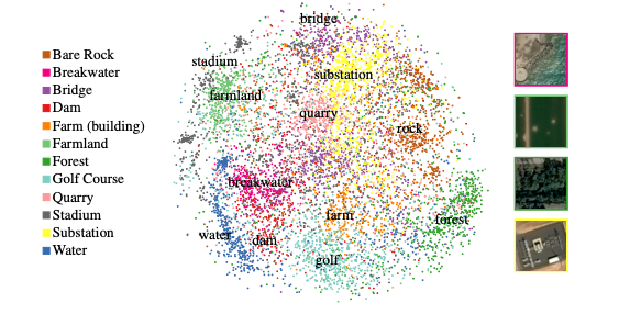 The model is evaluated in the OpenStreetMap object category by how well it are able to cluster scenes. The model’s accuracy is compared to that by ImageNet weights for various sensor/channel combinations