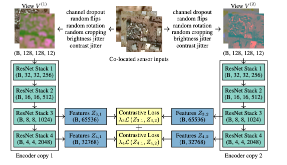 For training the authors created a ResNet 50 encoder and fed it two views. The views are of the same location, but it is different because they have been captured by different sensors or have different brightness, random flips or random channel drops. The two encoders are then trained to create the same output for those different views. In this way the network cannot focus on pixel information but is forced to rely on the information as a whole.