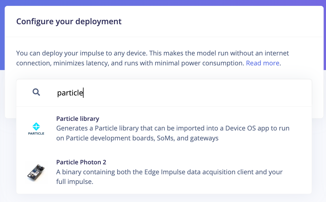 Alternatively if you already have a compatible Particle device you can skip ahead and follow the steps in the deploy your model as a particle library, which should work with most compatible particle devices.