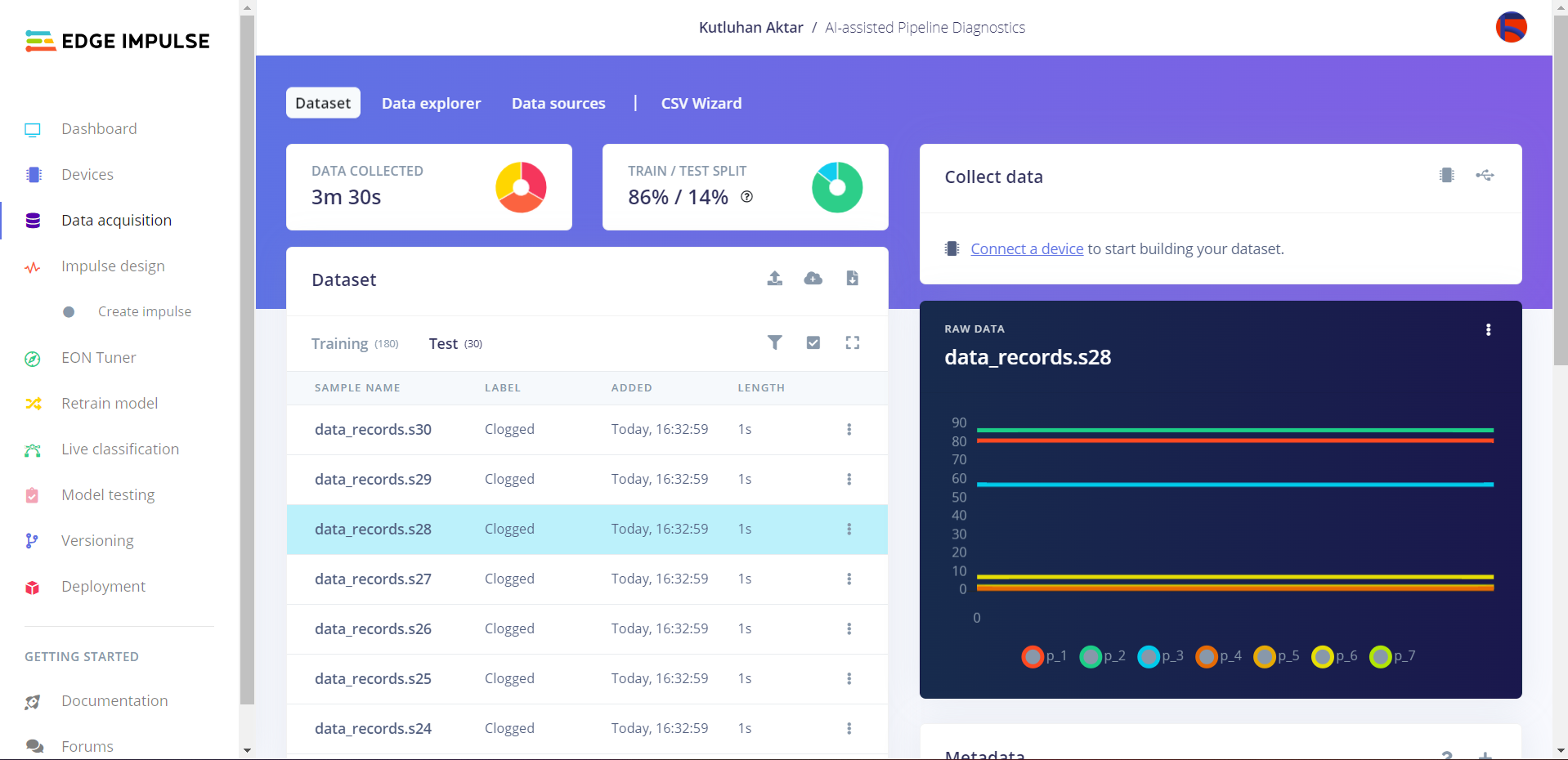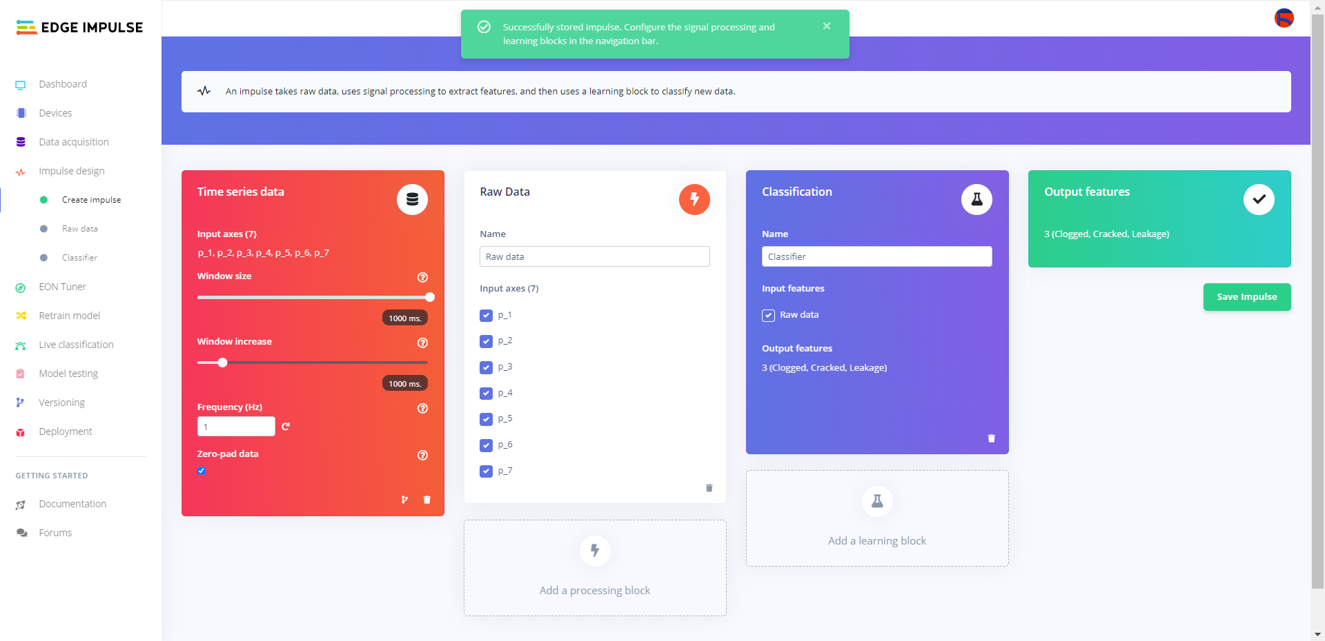 Before creating the software, a dataset needed to be collected to train the machine learning algorithm. Aktar took a trip to the hardware store, then built a very simple pipeline of his own from PVC pipes and fittings. Three types of pipe defects were simulated in this setup — clogs, cracks, and leaks. A mini aquarium pump was then used to move water through the system. Software was written to collect data from the mmWave module as it recorded vibrations in the pipe as water passed through the defect regions. This data was converted to a CSV-formatted file, then was uploaded to a project in Edge Impulse Studio using the CSV Wizard.