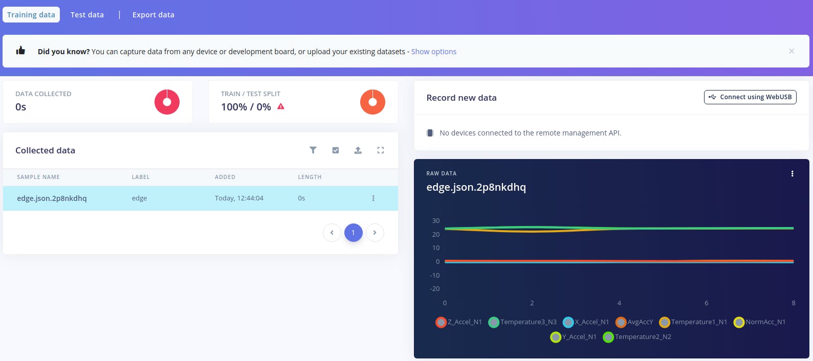}Then, we’ll need to upload the JSON data exported from TinyAutomator to Edge Impulse. Go to Data acquisition -> Let’s collect some data -> Upload data (Go to the uploader). Select the JSON file and click Begin Upload. Now you should be able to see the device and the data: