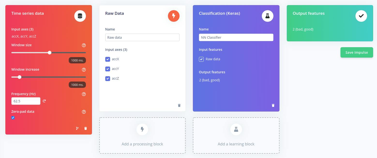 Now that we’ve gathered some data from the sensors, we can build, train, and deploy a Machine Learning model. For this task, we recommend using Edge Impulse that helps you create an ML model from a dataset in a visual way using low-code programming. We also recommend reading this tutorial to get a proper understanding of all the available features on Edge Impulse.