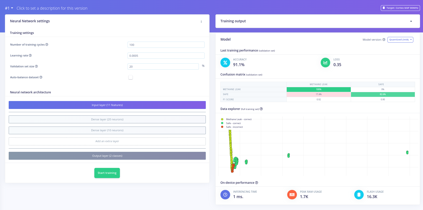 The data forwarder makes it easy to collect training data by capturing sensor measurements from the linked hardware device, then automatically forwarding them to an Edge Impulse Studio project. And data collection is exactly what Zalmotek needed to do at this point. These samples are what the machine learning classifier needs to learn the difference between normal, safe conditions and a dangerous methane leak.