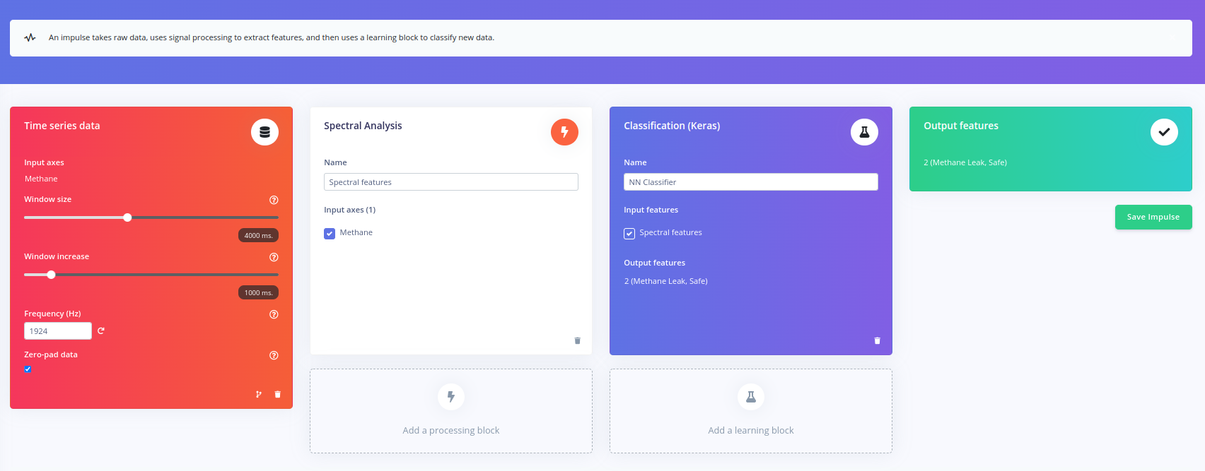 The next step is the fun part — it involves turning that raw data into knowledge. This is accomplished by creating an impulse, which specifies the end-to-end data analysis and processing pipeline that, in this case, will turn sensor readings into a prediction as to whether or not a gas leak has occurred.