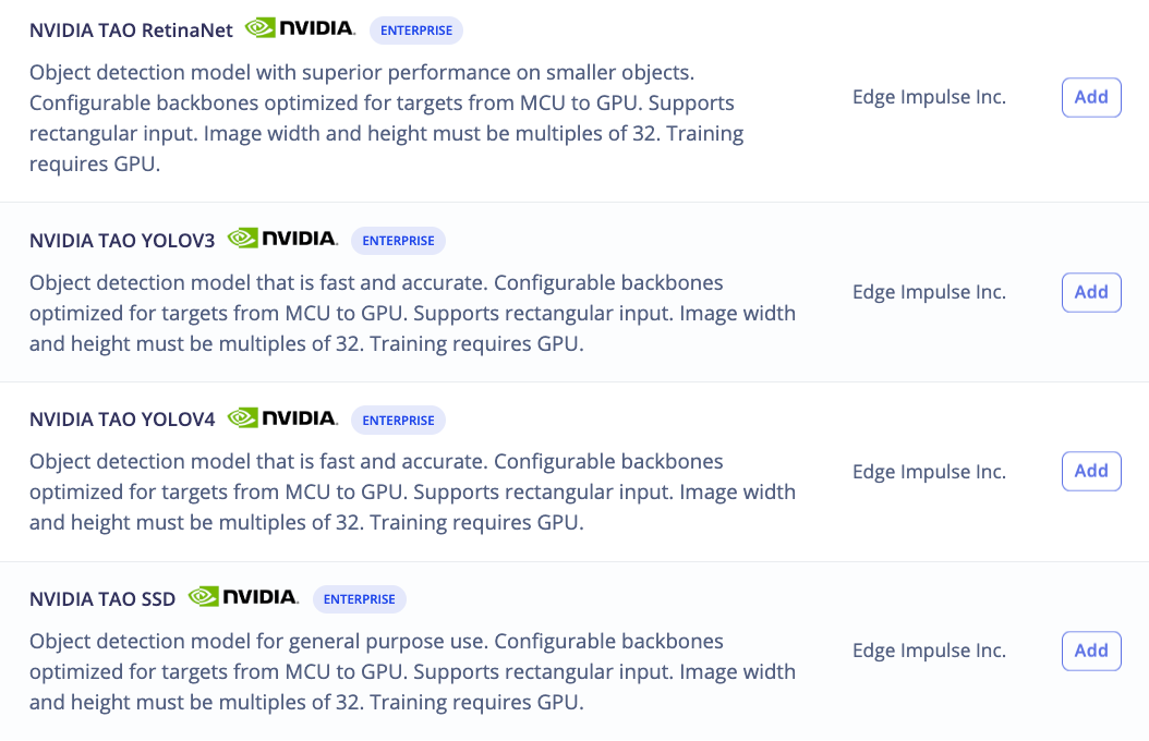 The RA8D1 is the first Cortex-M85 microcontroller in the market. The Cortex-M85 is also one of the first to support Arm Helium™ technology, which delivers a significant performance uplift for machine learning (ML) and digital signal processing (DSP) algorithms. With the combination of Arm Helium technology along with NVIDIA TAO, Edge Impulse is able to create sophisticated low-power computer vision models capable of running on the RA8D1. The RA8D1 is fully supported in Edge Impulse, which makes it a perfect target for deploying the new TAO models. Professional developers can choose from the following set of NVIDIA TAO model architectures, namely RetinaNet, SSD, YOLOV3, and YOLOV4.