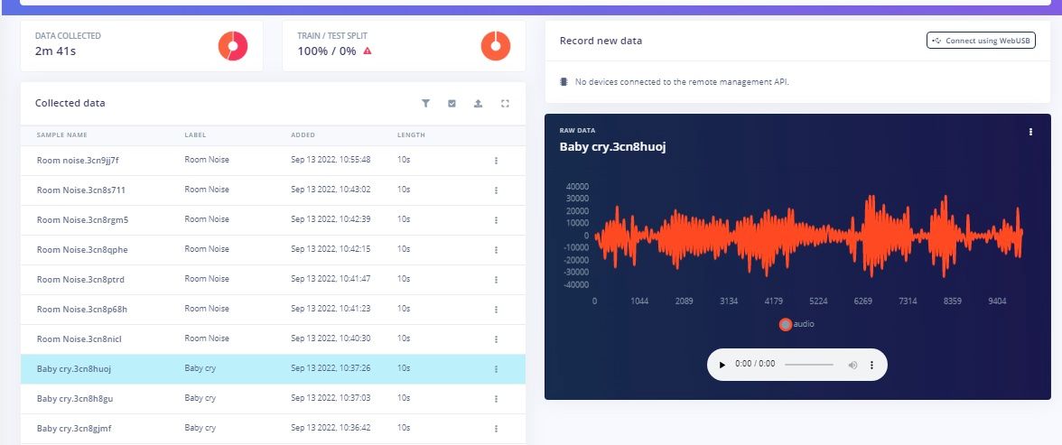 Before the classification algorithm could recognize the sound of a baby crying, it needed to be provided with sample audio data. Sivan downloaded a custom firmware image that linked his Portenta H7 directly to his Edge Impulse project, which allowed him to capture data with the device’s microphone and have it automatically uploaded to Edge Impulse Studio. In this way he collected a small, custom dataset consisting of just under three minutes of audio. The samples fell into two classes — “baby crying” and “normal background noises.”