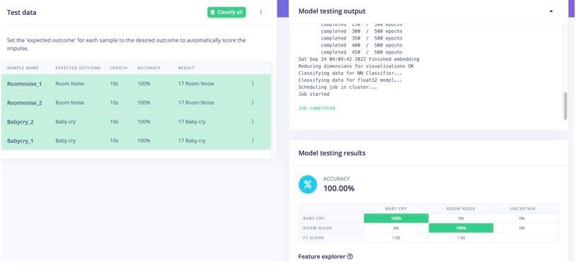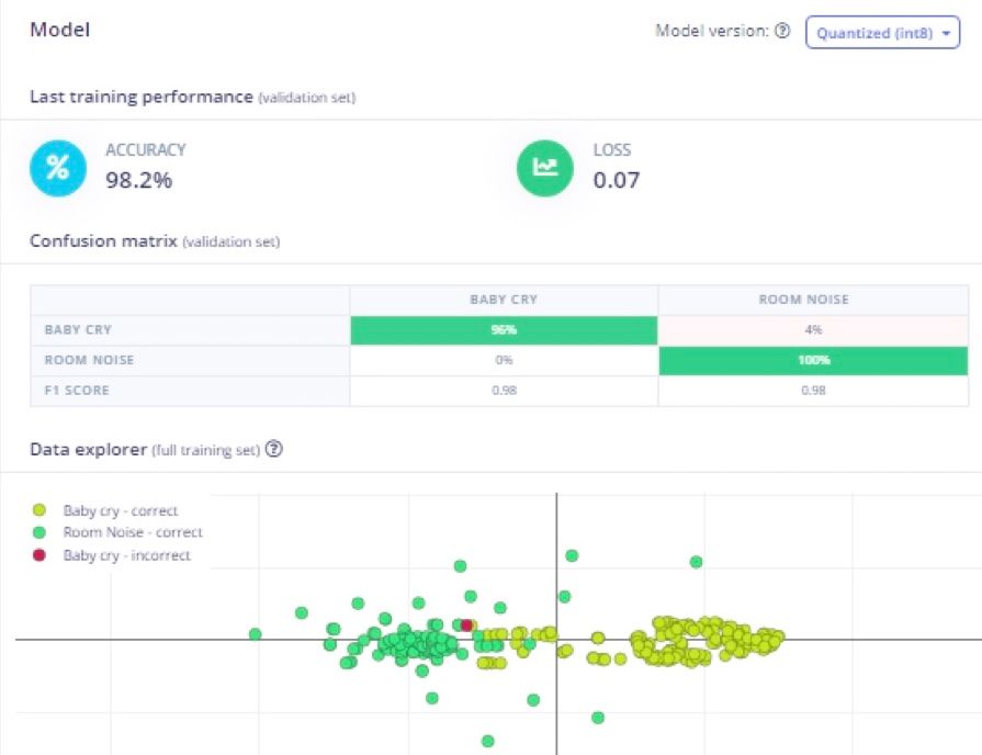 To process this data, an impulse was created that began with a step to convert the audio data into a spectrogram. This preprocessing step allows the audio data to be analyzed by algorithms that are designed for dealing with image data, and also helps to bring the most relevant features to light. The spectrogram was then passed on to a convolutional neural network that can classify audio into one of the two classes present in the training data. After the training process completed, an average classification accuracy rate of 98.2% was reported. This is an exceptional result considering that a very small amount of training data was supplied.