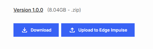 Each dataset card shows description, preview images, image count, file size, classes, version, license. - Click Upload to Edge Impulse on your chosen dataset.