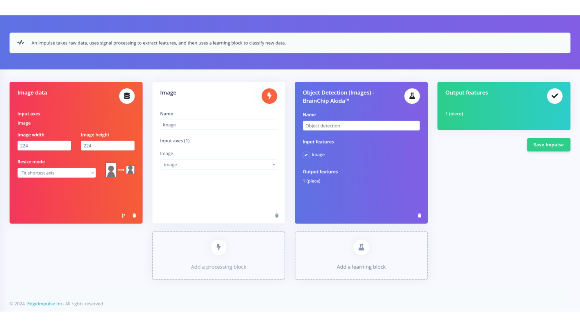 Once the annotation is complete, the next step is to create an impulse. This defines each step of the data processing pipeline, from collecting a new data point to making a prediction with the machine learning algorithm. For this application, the first step resizes the images captured by the camera — this has the effect of reducing the computational resources that are needed downstream. Next, the most important features from the raw data are extracted before being forwarded into Edge Impulse’s own FOMO object detection algorithm, which has been optimized for use on Akida hardware accelerators. The output of the model is a list of detected objects and their locations in the image.