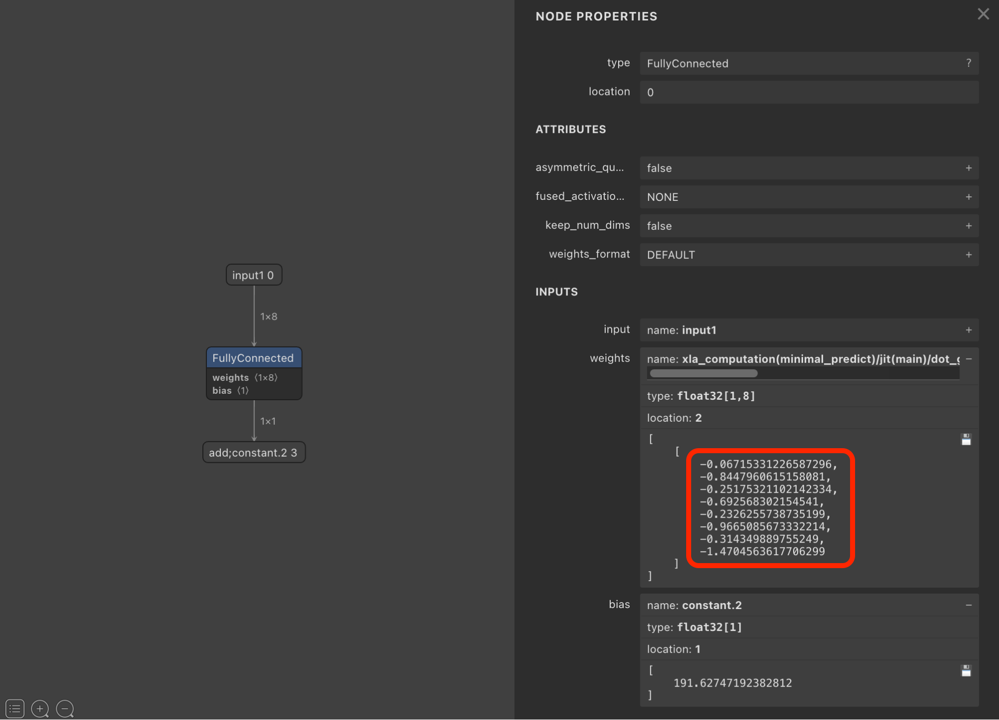 The weights in this model (8 values in the red box) tell us that the 8th feature in our data has the largest impact on the model because this feature has the largest absolute value. In this example, the input features are from a temperature sensor but this interpretability can be used with any model input features.