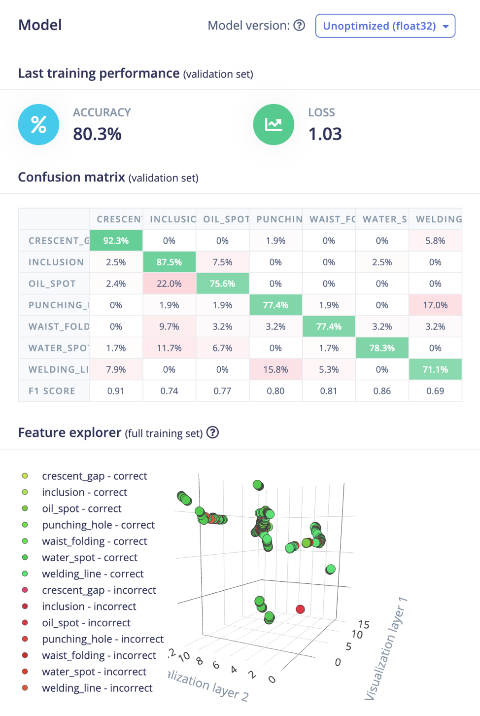 To make this system work, a training dataset was first located and uploaded to Edge Impulse. Next, the images were preprocessed to reduce the computational overhead associated with the classification task. Finally, transfer learning was utilized to take advantage of a MobileNetV2 model that had already been pretrained on a very large image database. This model was then further trained on the 1,573 image dataset previously collected to allow it to recognize defects in steel. Validation of the trained model showed that classification accuracy had reached 80.3%.