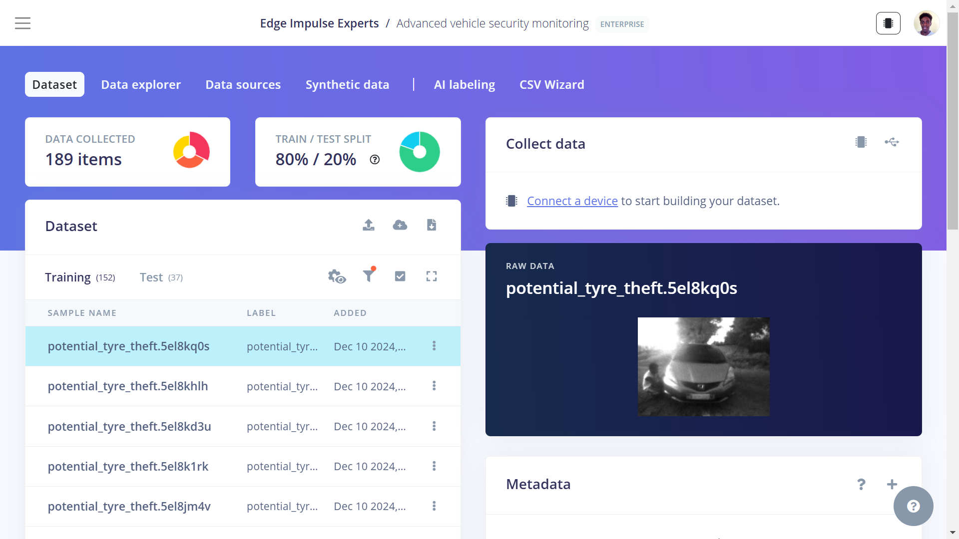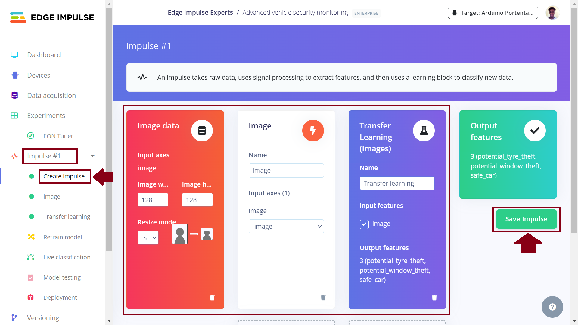 The Portenta H7 is fully supported by Edge Impulse, so data collection was as easy as installing the latest firmware on the board, then capturing images while acting like a crook that is trying to steal the car. When the device is linked to an Edge Impulse project, those images are automatically uploaded and waiting when you are ready to move on to the next step in the development process.