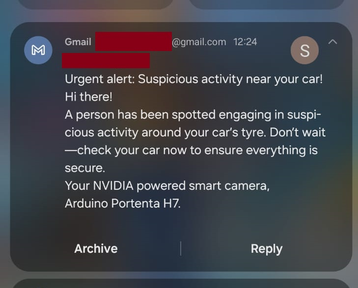 Githu downloaded his model as an OpenMV IDE library, which gave him the flexibility to add custom code that sends an email to a designated address whenever suspicious activity is detected. This could, of course, also be a phone notification, text message, or whatever else a given application calls for.
