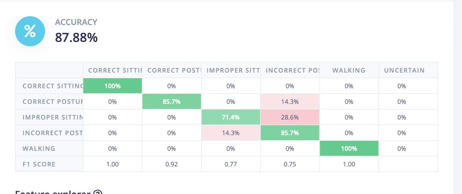 An impulse was created to process this uploaded data. A preprocessing step first split the stream of accelerometer data into windows, and the data windows were fed into a sequential dense neural network for classification. With the pipeline finished, the training process was initiated with the click of a button. After a short time, a report was displayed showing that the classification accuracy had reached 100%. Such a high level of accuracy always raises concerns about model overfitting, so Sivan next used the model testing tool. This is a more stringent test that classifies a set of samples that were excluded from the training process. This test revealed that an average classification accuracy rate of better than 87% had been achieved. That is more than good enough to prove the concept, but it was noted that improper sitting posture was getting mixed up with improper lifting posture at times. In the future this could be improved by collecting more data, and from a more diverse group of individuals.