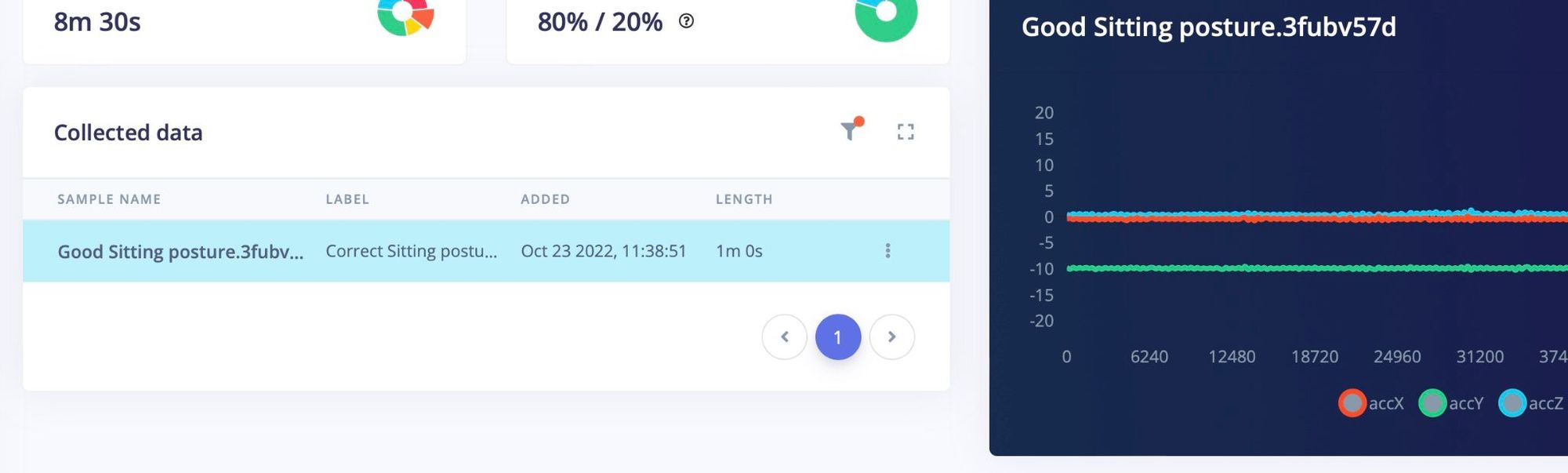 To build an intelligent algorithm, sample data was needed to teach it to recognize different body postures. The development board is fully supported by Edge Impulse, so Sivan first downloaded a custom firmware image that allowed him to link the device directly to his Edge Impulse Studio project. With that done, he was free to collect data from the board’s sensors and have it automatically uploaded to his project. He collected a few minutes of accelerometer data for each of the five selected classes — good and bad posture while sitting, good and bad posture while lifting, and walking. After the data was uploaded, it was automatically split into training and test datasets.