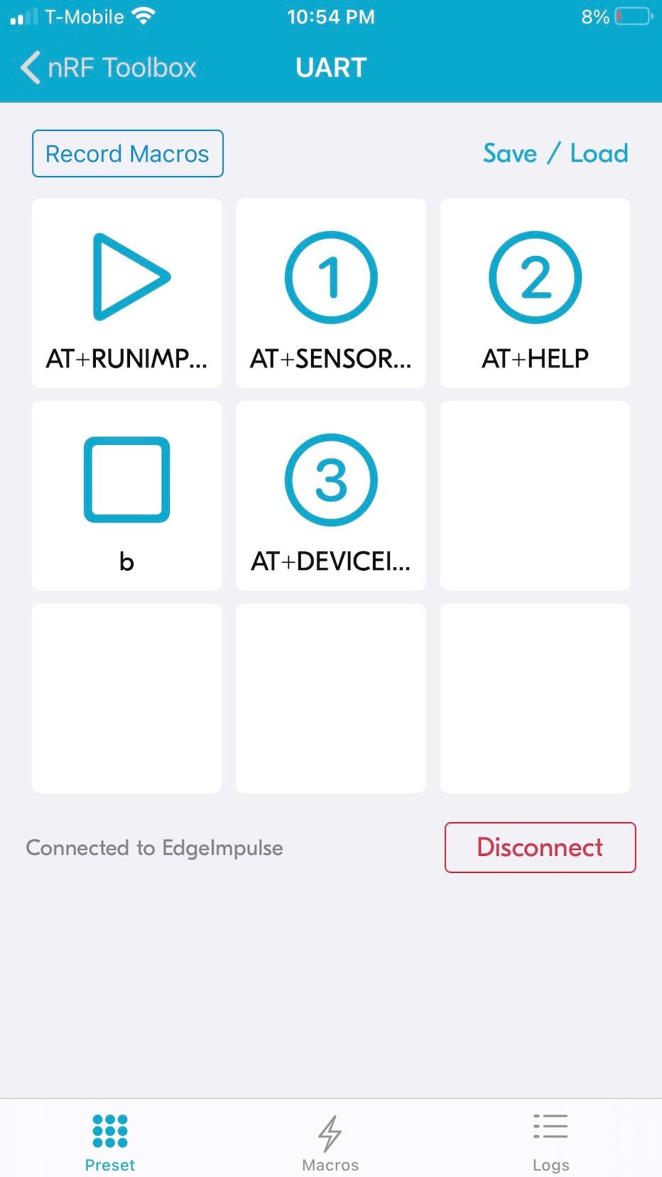 After following the instructions in the example’s readme, download the nRF Toolbox mobile application (available on both iOS and Android) and connect to the nRF52840 DK or the nRF5340 DK that will be discovered as “Edge Impulse”. Once connected, set up the interface as follows so that you can get information about the device, available sensors, and start/stop the inferencing process. Save the preset configuration so that you can load it again for future use. Fill out the text of the various commands to use the same convention as what is used for the Edge Impulse AT command set. For example, sending AT+RUNIMPULSE starts the inferencing process on the device.