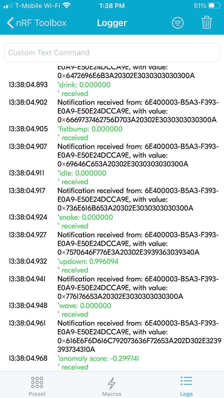 Once the appropriate AT command set mapping to an icon has been done, hit the appropriate icon. Hitting the ‘play’ button cause the device to start acquiring data and perform inference every couple of seconds. The results can be viewed in the “Logs” menu as shown below.
