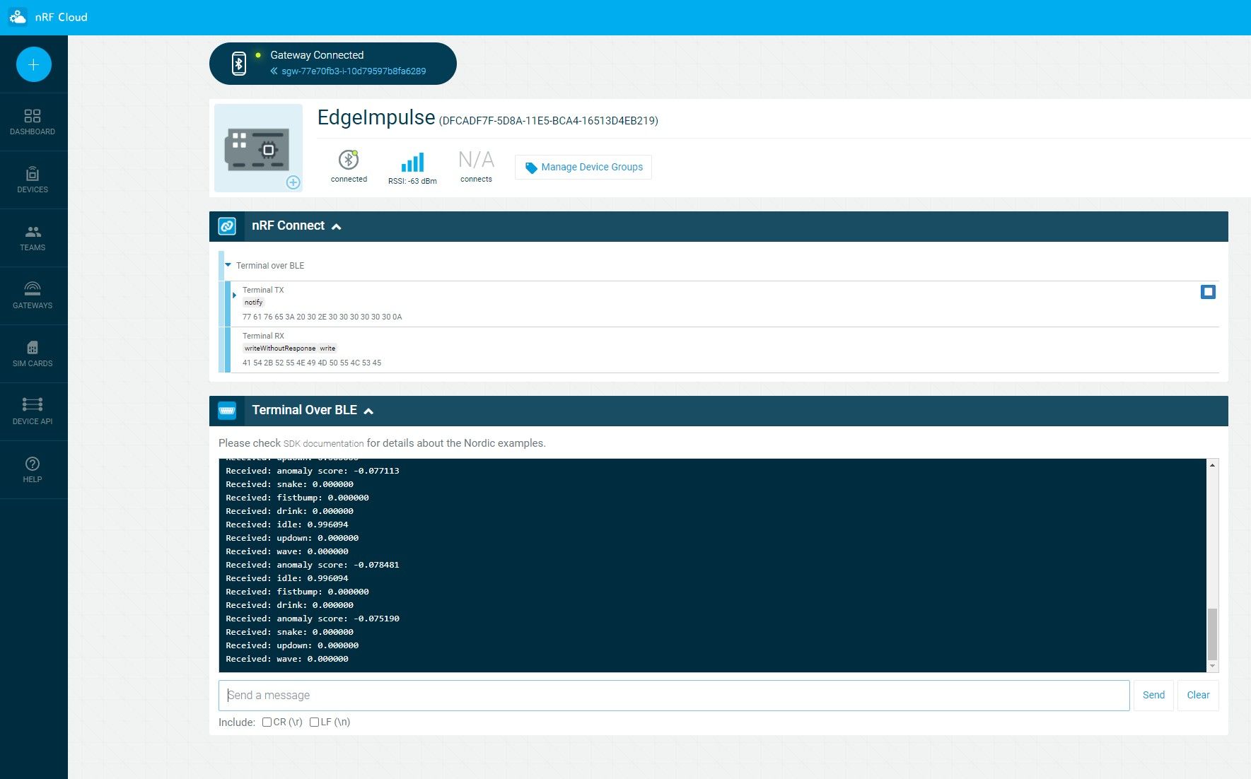 Using the nRF Connect for Cloud mobile app for iOS and Android, you can turn your smartphone into a BLE gateway. This allows users to easily connect their BLE NUS devices running Edge Impulse to the nRF Cloud as an easy way to send the inferencing conclusions to the cloud. It’s as easy as setting up the BLE gateway through the app, connecting to the “Edge Impulse” device and watching the same results being displayed in the “Terminal over BLE” window shown below!