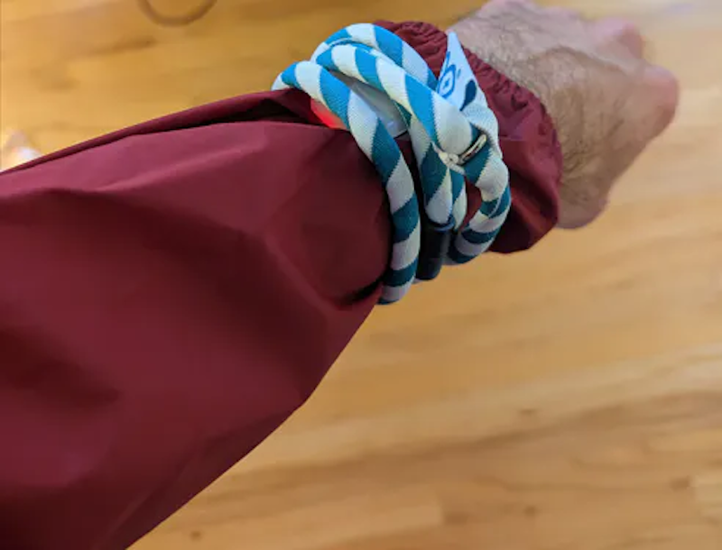 With the plan hammered out, it was time to collect some training data to teach the gesture recognition model to know what to look for. So, a very DIY wristband was created using the included Arduino lanyard (ideally, this would be accomplished with a pouch on the sleeve to slide the Nicla Sense ME into) so that the accelerometer could capture arm movements. Then, samples of standing still, walking, and drawing the letter “C” in the air were collected during a hike. These samples were then all uploaded to Edge Impulse Studio using the data acquisition tool. About 15 minutes of data was captured in total.