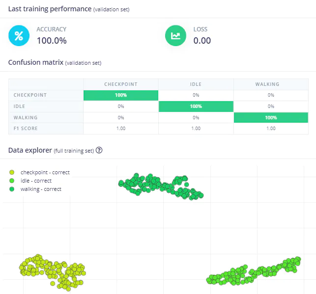 To get an idea of how informative the training data is, and how likely it is to produce an accurate model, the Feature Explorer tool was utilized. This showed that there was excellent separation between the data points that comprised each class. With no apparent data problems detected, the training process was initiated with a simple button click. After about a minute, training had completed, and metrics were presented to help assess how good of a job the model was doing.