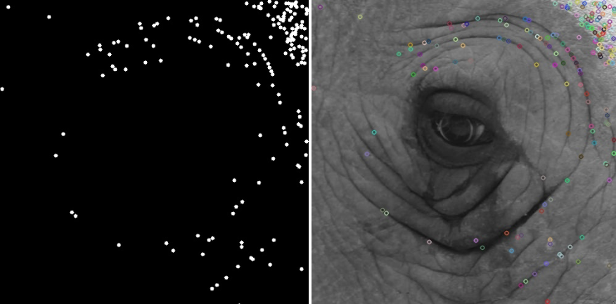 Yet another experiment was to run SIFT (Scale-Invariant Feature Transform) on the rhino eye images. SIFT is widely used for feature detection, matching, and image stitching, as its capability to identify points of interest characterized by significant variation in all directions, typically at corners or edges. When comparing two images, keypoints between them are matched based on the similarity of their descriptors. This method has been successfully employed for identifying various species in the Wildbook project by WildMe, and definitely interesting to further explore for this case of rhino eyes.