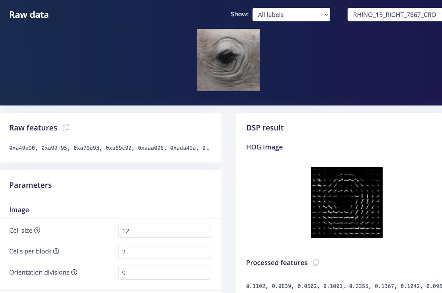 Another approach we tried for feature extraction was using HOG (Histogram of Oriented Gradients), which is effective in capturing the gradient structures of images, such as edges and texture patterns. This method diverges from CNNs, as HOG generates a 1D representation of each image. HOG was tested in Studio as a custom DSP block with adjustable parameters. Using this DSP block together with a classification model showed promising results for a limited number of individuals (<10). However, a similarity search approach likely remains the better strategy for an expanding dataset.