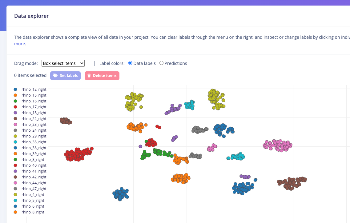 One experiment involved extracting features using an EfficientNet B0 model, i.e. retrieving the features before the classification layer, and using these in search of the nearest neighbors. In a test with this approach involving 22 individuals, 43% of the samples matched the top individual presented, and 77% matched one of the top five individuals presented. The graph below illustrates the clustering of images after fine-tuning the EfficientNet B0 model in Studio and applying t-SNE for dimension reduction in the data explorer.