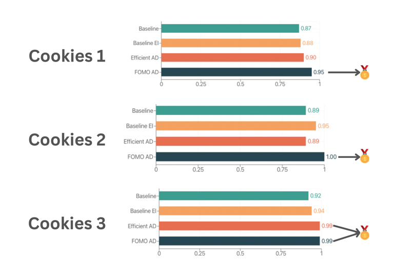 Having trained all of the model options, Lescaudron did some benchmarking to determine which ones performed the best. In each case (no anomaly, or an anomaly of varying degrees), FOMO-AD proved to perform the best as measured by the reported F1 score. FOMO-AD also proved to be the most efficient — inference times were almost ten times faster than what was observed with EfficientAD. These findings, in conjunction with the ease with which FOMO-AD pipelines can be produced, mean that it is generally the best option for most applications.