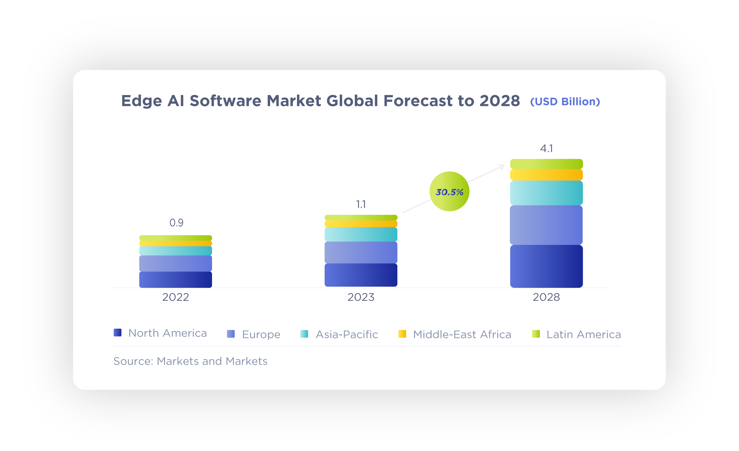 The global market for edge Al software is projected to grow from $1.1 billion USD in 2023 to $4.1 billion USD by 2028.