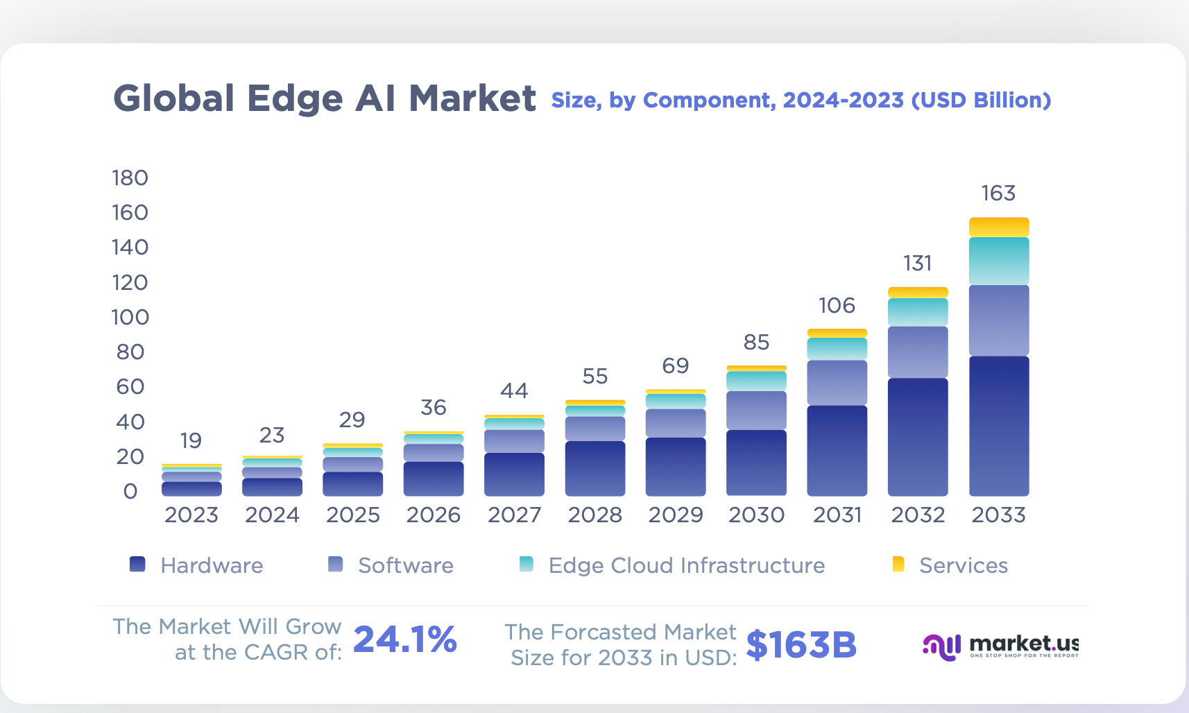 The global edge AI market size is expected to be worth around 163 Billion USD by 2033, up from 19 Billion USD in 2023.