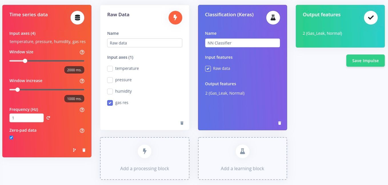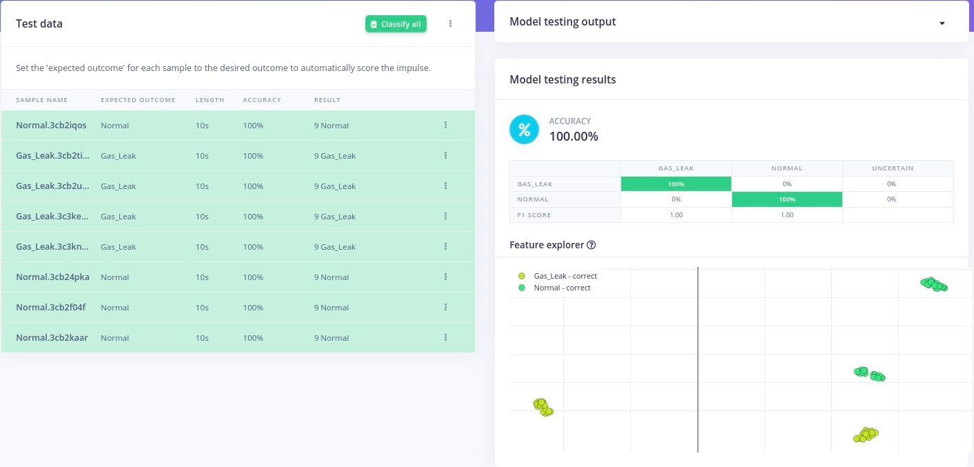 All of the gas data was combined into a “gas leak” class, and the remainder was labeled as “normal.” With data collection out of the way, an impulse was created to analyze gas samples. It began with a preprocessing step that splits sensor readings into two second windows. Those measurements were then fed into a neural network classifier. After tuning the model’s hyperparameters, the training process was kicked off. After a short time, training had completed, and a confusion matrix was presented to help in understanding how well the model was performing. An average classification accuracy rate of better than 86% had been achieved. This result was further validated using the more stringent model testing tool. This reported that a classification accuracy of nearly 96% was observed on data that was not included in the training process.